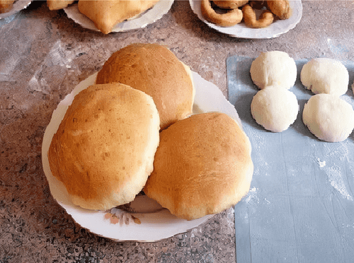 Add yeast and baking soda to the flour and mix. Now knead the dough. It should be elastic. Let it rise (to double in size).