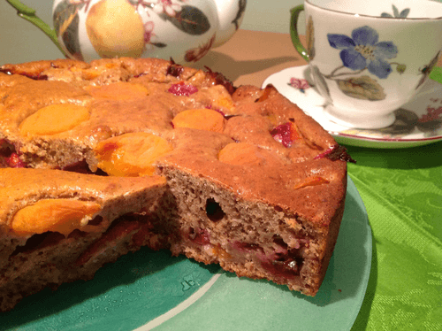 Pour part of the dough into the mold, place pieces of fruit, sprinkle with sugar (1 tablespoon), repeat, finish with dough on top, place halved apricots on top, sprinkle with sugar.