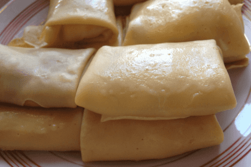 Heat the pan and grease it with oil. Pour the batter in a thin layer over its surface. Brown the pancakes on only one side.