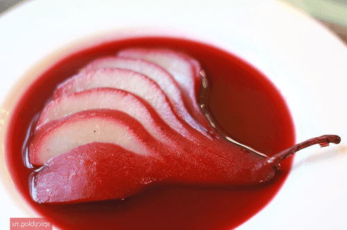 Pour in the red wine and add the peeled pears. Cook for 25-30 minutes without bringing to a boil. You can check the fruit's readiness by piercing it with a thin knife.