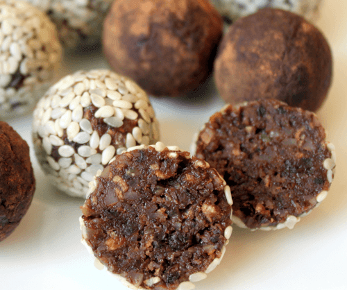 Coat the candies in cocoa and sesame (ground nuts can also be used).