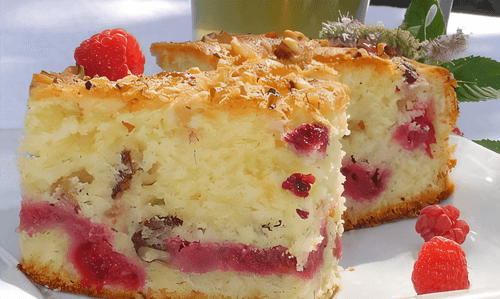 Grease the mold with oil and pour half of the batter, place 2/3 of the raspberries and half of the chopped nuts on top, pour the remaining batter, add raspberries, and sprinkle with nuts.