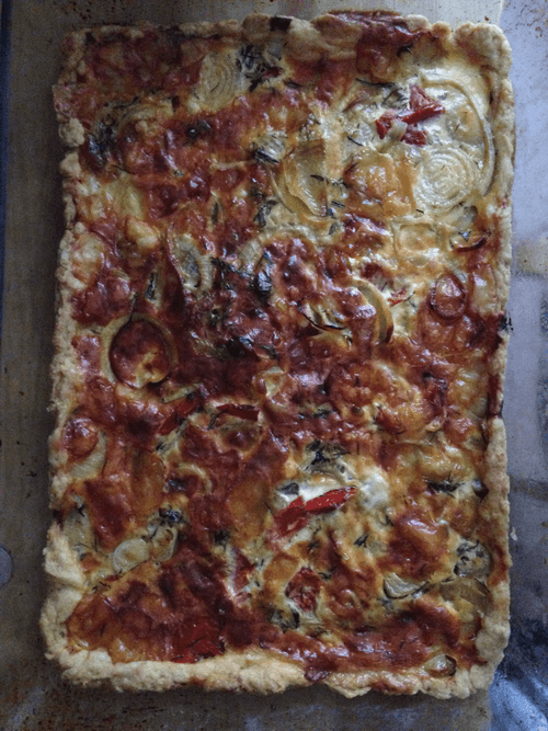 Quiche with cheese, onions and tomatoes