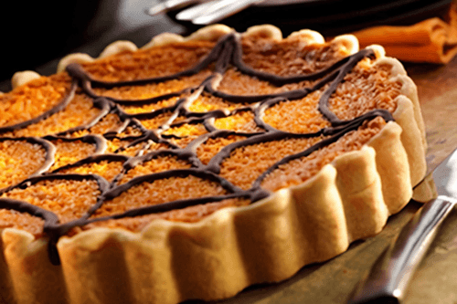 2, 3, and 4-oven AGA — place the baking tray on the third rack in the oven for roasting and leave for 45 minutes, up to 1 hour, until softened. Transfer the pumpkin mixture to a bowl, peel, and mash. Add cinnamon, ginger, and nutmeg, and mix well. Beat sugar with eggs and cream. Add to the spiced pumpkin puree in two stages. Spread the mixture over the dough. Bake on the bottom of the roasting oven for about 35–40 minutes until done. Allow the pie to cool. Use melted chocolate to decorate the pie with a spider web design. Serve cold with whipped cream.