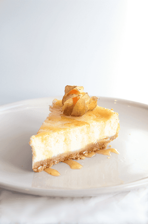 Decorate the cheesecake as desired — I decorate it with physalis and reduced apricot liqueur.