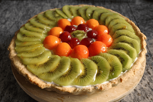 For the glaze, melt apricot jam and mix it with orange liqueur. Use a pastry brush to coat the fruits. Keep the tart in the refrigerator until serving.