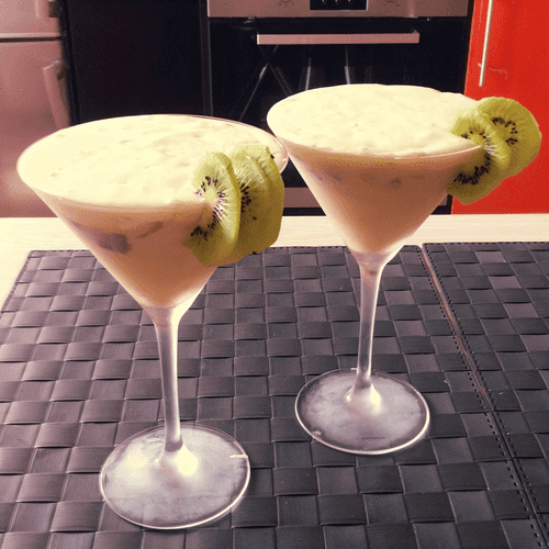 Layer the obtained cream as the first layer in a glass dish, leaving space for the next layers (it is advisable to choose a deeper, glass dish without patterns to achieve the effect of a beautiful picture, as two delicate creams envelop the kiwi).