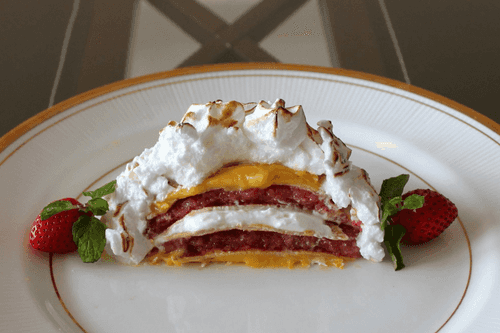 Baked Alaska with Pancakes, Strawberry Jello and Orange Curd