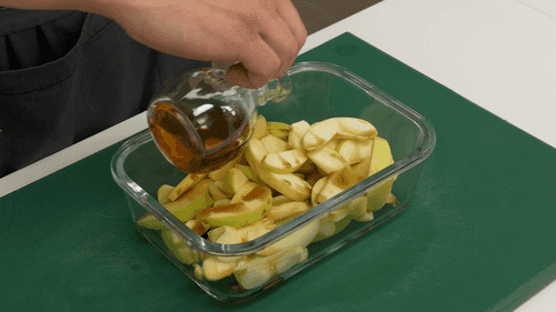 Thinly slice the apples and marinate them in cognac and syrup for 30 minutes.
