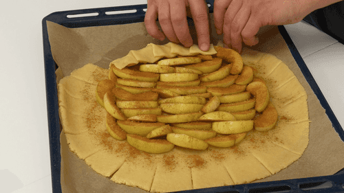 Roll out the dough, place a thin layer of apples on it, sprinkle with cinnamon and demerara, fold the edges of the dough inward, brush with melted butter, and bake at 190 degrees for 30 minutes.