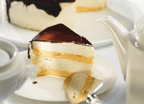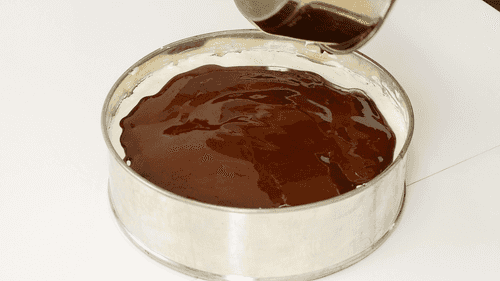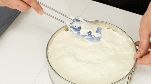 Place the first layer in the cake mold, pour half of the soufflé on top. Cover it with the second layer, pour the remaining soufflé. Put the cake in the fridge for three to four hours to let the soufflé set.