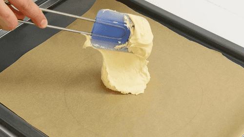 Line two baking trays with parchment paper, roll out the dough into two circles the size of the cake pan. Bake the layers at 200 degrees for ten minutes, trim the edges. Cool the layers without removing them from the paper.