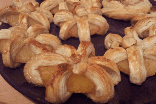 Pear and pineapple in syrup, baked in puff pastry