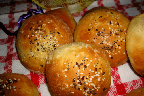 The prepared dough should be divided into 12 equal parts, and each should be shaped into a round bun. Place on a baking sheet lined with parchment paper. Cover and let rise for another 30-40 minutes. Then lightly brush with milk and sprinkle with sesame seeds. I sprinkled half and left half plain, as my husband doesn't really like toppings.