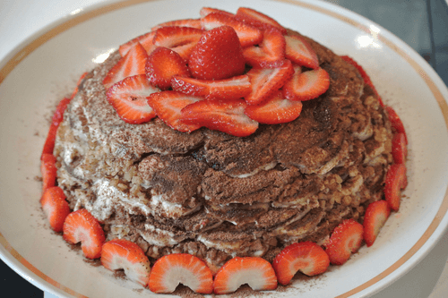 Chill for at least 3 hours (I recommend leaving it overnight). Then invert onto a plate and remove the film. Decorate with strawberry slices and grated chocolate.