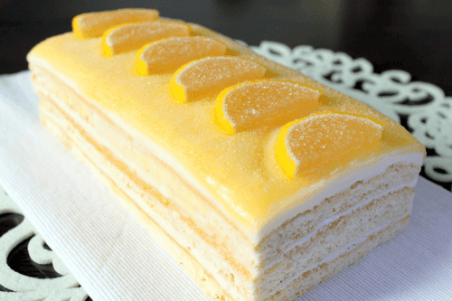 Cut the biscuit into 3 equal layers. Generously spread lemon curd on each layer. Place 1 layer in a springform pan (or create a high edge with foil). Pour 1/3 of the cheese cream onto the layer, smooth it out, and place it in the freezer for 10-15 minutes to set the cream. Repeat with the remaining layers. After the top layer of cheese cream has set, cover the cake with lemon curd and decorate with jelly lemon slices.