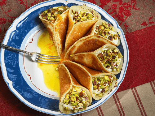 Place the pancakes with filling in a baking dish, sprinkle with crushed pistachios, drizzle with melted butter, and send to a preheated oven at 200 degrees for a few minutes - just to brown. Serve with tea and mint or thyme.