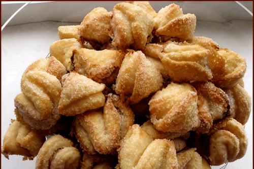 Then cut out circles with a glass and dip each circle on one side in sugar, fold the sugar side inward, and do this four times.