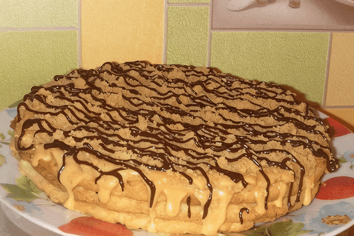 Sour cream cake with buttercream is a delicate treat from traditional Russian cuisine. Its base consists of thin, fragile layers soaked in velvety buttercream, topped with a layer of melted chocolate that adds exquisite sweetness to the dessert. The combination of sour cream and boiled condensed milk provides a rich, slightly caramel flavor, while the butter adds softness and tenderness to the cream. This cake is perfect for cozy home tea parties, family celebrations, and formal events where you want to delight guests with an exquisite yet simple and heartfelt dessert. Its pleasant tang from the sour cream balances the sweetness of the cream, creating a harmony of flavors that is irresistible. Enjoy this classic treat!