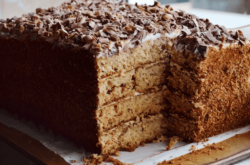 Butterless biscuit 'Medovik' is a refined version of the classic honey cake but with a light airy dough. This dessert, inspired by traditional Eastern European cuisine, combines the tenderness of sponge cake with the rich flavor of honey and a nutty note. Its origin traces back to the famous 'Medovik,' a favorite treat at the court of Russian emperors. Here, sour cream replaces butter, giving the cake a special tenderness. The taste is soft, sweet, with caramel hints of honey and a subtle nut crunch. It's an ideal dessert for festive tables or cozy tea times and pairs wonderfully with aromatic tea or coffee. Finally, a sprinkle of chocolate adds an exquisite touch to its delightful flavor.