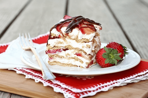 Using a hand mixer, whip 3 cups of cream to stiff peaks. Add powdered sugar and vanilla, and mix until smooth. Spread a thin layer of cream at the bottom of the dish. Place 6 cookies on top. Then another layer of cream and then strawberries. Repeat these layers three times, with the last layer being cream.