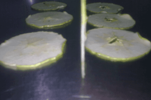 We slice the apples with the skin using a slicer. Soak in syrup for 30 minutes.