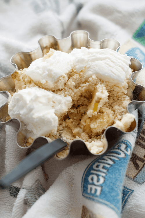 Place the apples in portion forms (or in one larger form), drizzle with honey, and sprinkle with cinnamon. Top with crumbled dough.