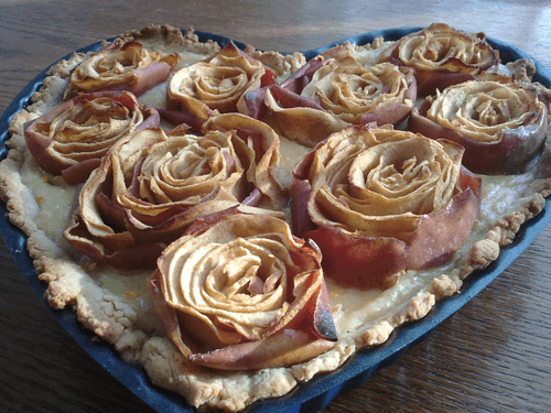 Apple pie decorated with roses, with custard