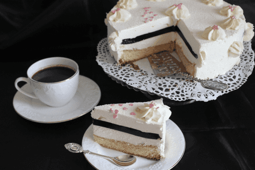 A delicate cake with cherry jelly is a harmony of airy sponge soaked in aromatic cognac-honey syrup and a refreshing layer of cherry jelly. Its origin can be linked to the traditions of European pastry schools, where the refinement of textures and balance of flavors are valued. The lightness of the creamy mousse enveloping the cake makes it an ideal dessert for special occasions. The cherry jelly adds a tangy acidity that harmoniously complements the sweetness of the sponge and cream. This cake not only delights with its taste but also looks stunning thanks to its velvety finish that creates an elegant effect. Perfect for festive tables, romantic evenings, and cozy family tea gatherings.