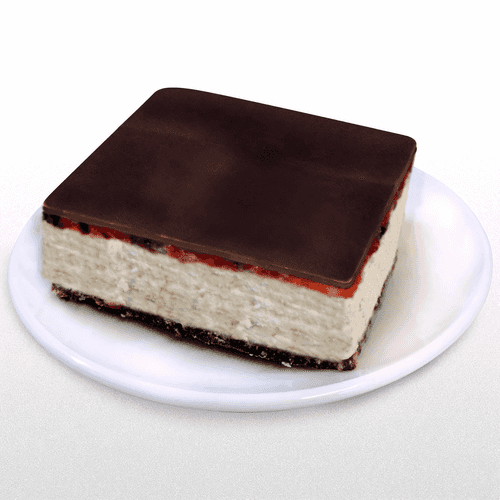Dip the mold with the set curd mass in hot water for a few seconds and carefully place the contents on the prepared cake base. Spread thick fruit jam on top and coat the entire cake with slightly warm, melted chocolate from a water bath. Refrigerate overnight.