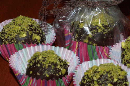 Send the chocolate ball to set on a plate or baking paper. While the chocolate is still soft, sprinkle with ground pistachios.