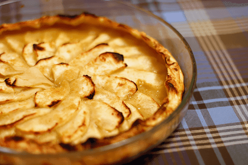 We wash and clean the apples, remove and discard the core, put the peels in a blender, add a packet of vanilla sugar, a bit of cinnamon, 2-3 tablespoons of sugar, and 5-7 pieces of orange zest (if you soak the peels in cold water for a day, they won't be bitter at all; bitterness changes the taste and adds a certain piquancy — we leave this point of the recipe to your choice), chop randomly and also put in the blender all the poorly cut apple pieces along with 1 apple (or half if you don't have enough apples for an elegant arrangement in the baking dish). You won't spoil the pie if you add 1-3 teaspoons of white table wine or cognac to the blender. Blend until it reaches a mushy consistency.