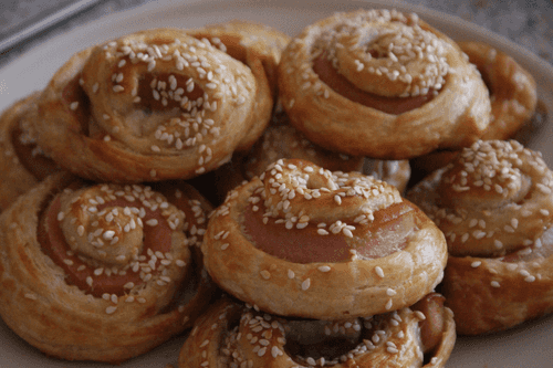 Puff pastry rolls with sausages are a simple yet incredibly appetizing snack from European cuisine. Their crispy puff pastry combined with tender sausages creates a harmonious balance of flavors. The ease of preparation makes this dish an excellent choice for quick snacks, home parties, and picnics. The history of such snacks traces back to traditional French and German pastries, where the dough served as a shell for meat fillings. These rolls can be served with favorite sauces that enhance their rich flavor. Sesame sprinkled on top adds a nutty note and pleasant aroma. Toasted to a golden crust, they become the perfect treat for both adults and children.