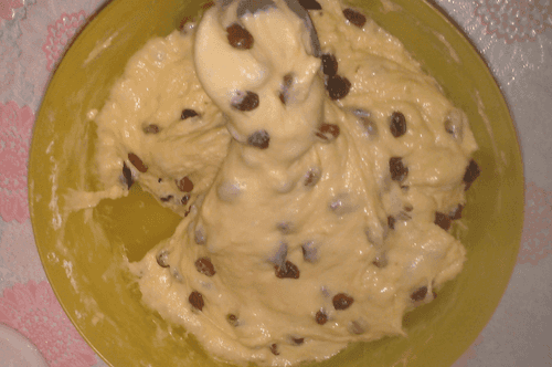 After the dough rises, melt the butter and add it to the dough, then add the raisins and mix. Let the dough rest for about 20 minutes to rise.