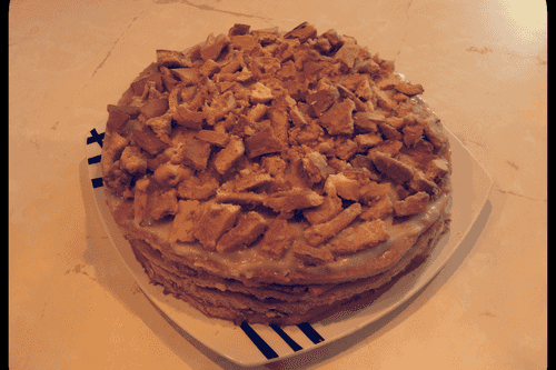 When everything is ready, assemble the cake. Layer the cakes one by one and spread with cream.