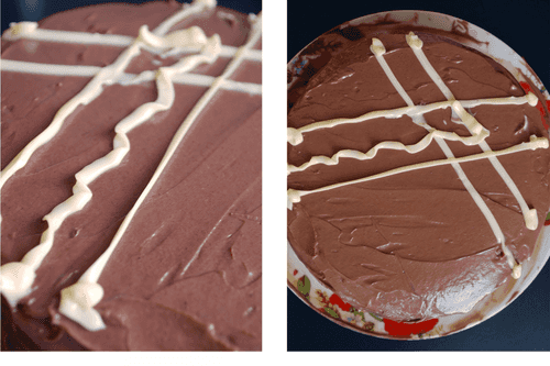 Make the cream. Whip the butter well, then gradually add condensed milk and cocoa powder. Then simply spread the cream on all sides of the layers.