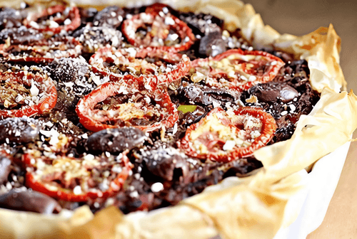The tart with roasted eggplants and sweet peppers is a refined dish of Italian cuisine that combines the tenderness of puff pastry with a fragrant vegetable filling. Roasted eggplants and sweet peppers acquire a rich flavor with a slight smokiness, while the addition of fresh tomatoes, shallots, garlic, and herbs makes the filling juicy and spicy. Balsamic vinegar and lemon juice give it a sophisticated tanginess, while spices enhance the richness of the taste. This tart is perfect for both a warm family dinner and a festive table. It is good both hot and cold, maintaining its texture and richness of flavor nuances. Light, aromatic, and elegant, it will be a true decoration for your meal.