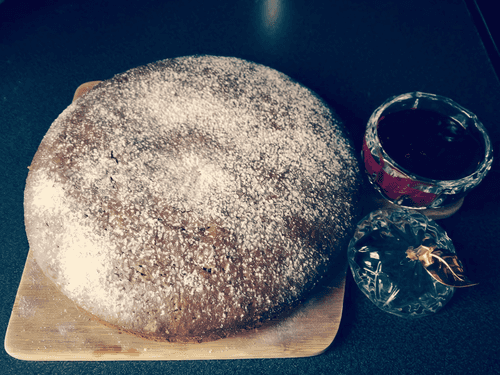 Preheat the oven to 165 degrees. Bake for 35–45 minutes (if the cake rises unevenly, flip it after 20–25 minutes). Remove the cake from the mold, dust with powdered sugar, and serve with fruit sauce.