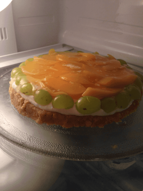 Slice the peaches and place them on the cheesecake that has set by this time. Carefully pour the cooled gelatin syrup over the cheesecake and refrigerate for another 2-3 hours.