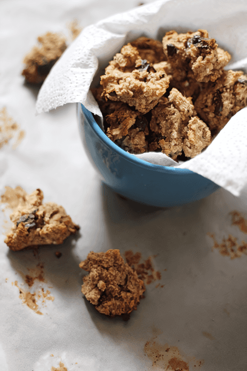 Add the banana mixture to the oatmeal mix, and place the resulting dough in small portions on a baking sheet lined with parchment paper.
