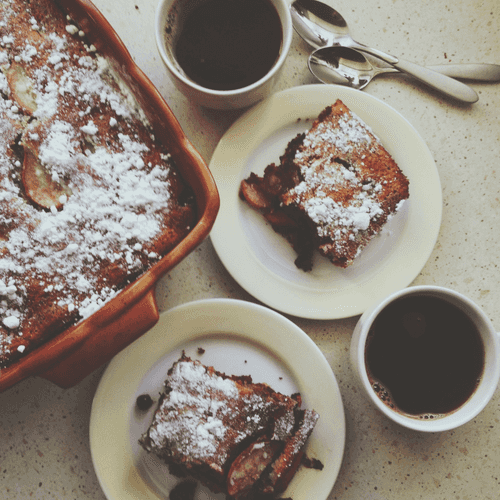 Grease the baking pan with butter. First pour in the chocolate batter, then layer 2/3 of all the pears, thinly sliced. Pour in the other batter and carefully place the remaining pears on top.