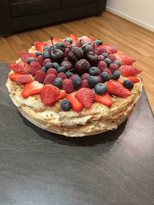 Start spreading the layers with cream, leaving one to decorate the cake later. Once the layers are coated, crumble the remaining layer and sprinkle it on the cake.