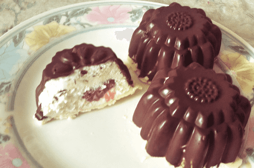 Place raspberries in each mold, cover with cottage cheese, and coat with melted white chocolate.