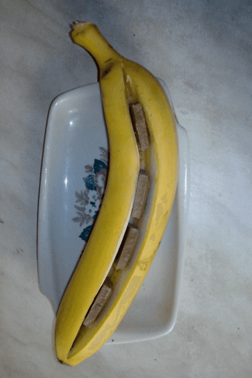 So, we take a banana, cut it lengthwise but not all the way through. We insert chocolate pieces into the cut and place it in the microwave (time — until the chocolate melts). Eat it hot with ice cream.