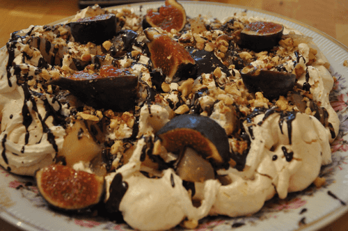 We sprinkle the meringue with nuts, cream, drizzle with chocolate sauce, and place the pear on top, adding more cream, pear, nuts, and decorate with figs. Finally, we drizzle with the remaining chocolate sauce and sprinkle with orange zest.
