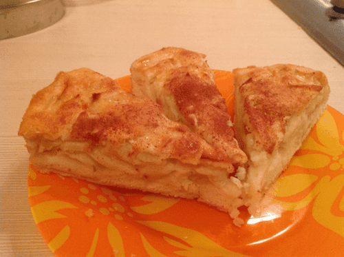 Pour the apple batter into the mold, spread it evenly, and sprinkle with cinnamon.