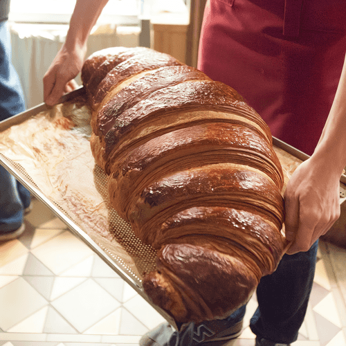 The giant croissant is a true work of art in European baking. This airy, flaky, and buttery masterpiece originates from France, where the croissant became a symbol of morning gastronomy. Its rich flavor unfolds thanks to cream, butter, and rye sourdough, creating a delicate balance of sweetness and crispness. Such a croissant is not just a morning dessert — it can serve as a base for creative fillings: from chocolate to herb cheese. Perfect for festive breakfasts, cozy family gatherings, or simply enjoying the aroma of fresh pastry. The preparation takes time, but the result is worth every minute: a golden crust, tender dough, and unforgettable taste.