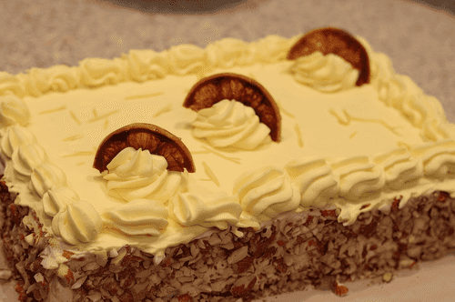 For decoration, whip 200 g of cream, color it yellow (2-3 drops of dye) and decorate the cake, sprinkle the sides with nuts. On top - lemon in caramel.