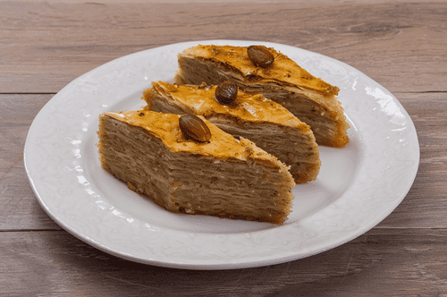 Baklava made from phyllo dough with almonds is an exquisite dessert of Eastern cuisine, rooted in the Ottoman Empire. This sweet pie soaked in aromatic citrus-infused sugar syrup has a delicate crispy texture created by layers of airy phyllo dough. The walnut filling with sugar adds a rich nutty flavor, while almond decorations complete the harmony of aromas. Melted butter adds tenderness, and the caramelized crust formed during baking makes each piece unique. Baklava is traditionally served chilled to allow the syrup to soak into the layers of dough, revealing a sweet honey-nut flavor. This traditional treat is perfect for festive gatherings and tea parties where deep flavor accents and rich texture are appreciated.