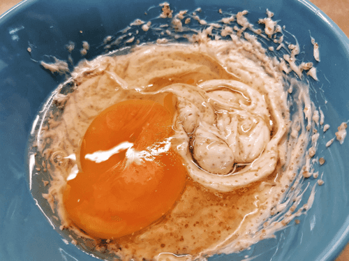Now add the flour to the egg-butter mixture and mix well. The dough turns a deep brown color right before your eyes.
